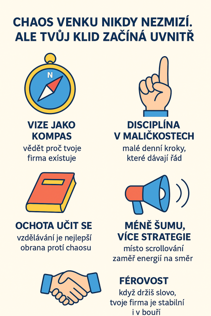Chaos venku tu vždycky bude. Ale tvůj klid začíná uvnitř – v jasné vizi, v disciplíně maličkostí, v ochotě učit se a růst. Začíná i v odvaze vypnout šum a držet se férovosti, i když je to těžší.